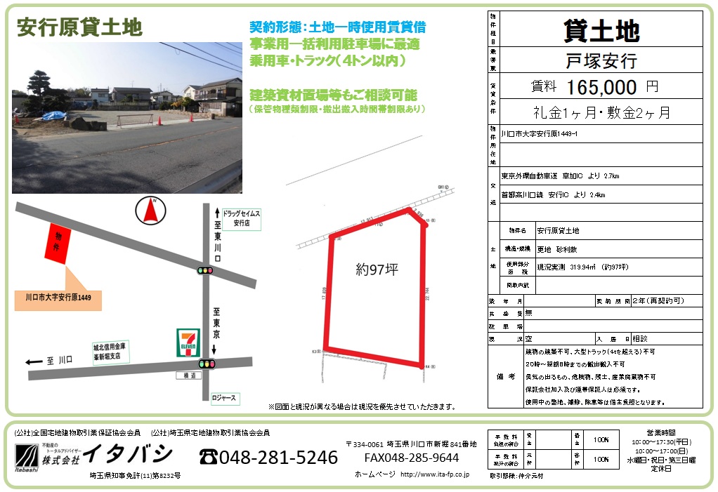 首都高速川口線、東京外環自動車よりアクセス良好。間口の広い平坦な土地です。一括駐車場に最適です。資材置場等でご利用の場合は制限があります。詳しくはお問い合わせ下さい。